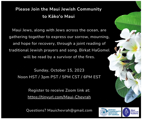 Birkat HaGomel will be read by a survivor of the Lahaina fires on behalf of other survivors, both in Israel and Maui.